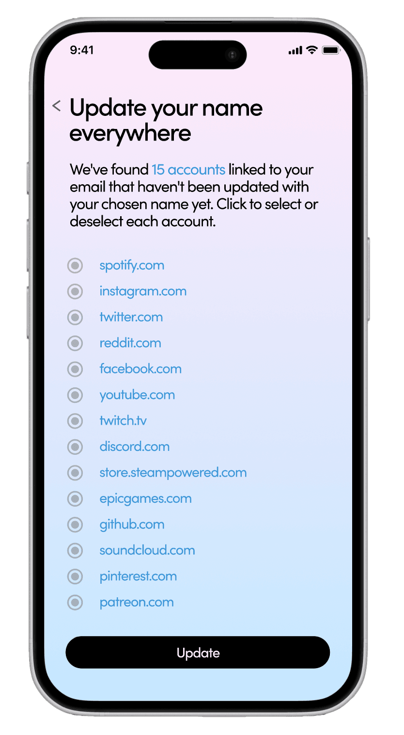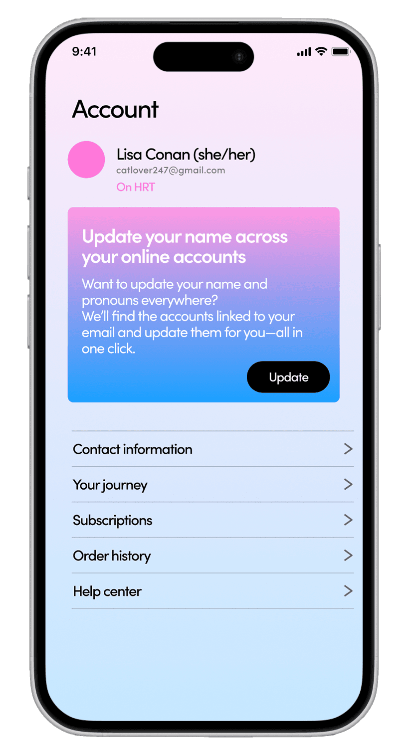 Updating your name online is an important step in a trans person’s journey, but it can be tedious and time-consuming. We make it easy by finding accounts linked to your email that haven’t been updated and changing them to your chosen name—all with one click.